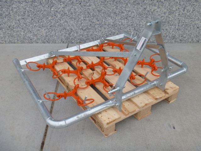 De sleepmat zorgt er vervolgens voor (eigenlijk net als een grove hark) dat de ondergrond losgekrabbeld en tevens gelijkmatig verdeeld wordt / Egalisatiehark.